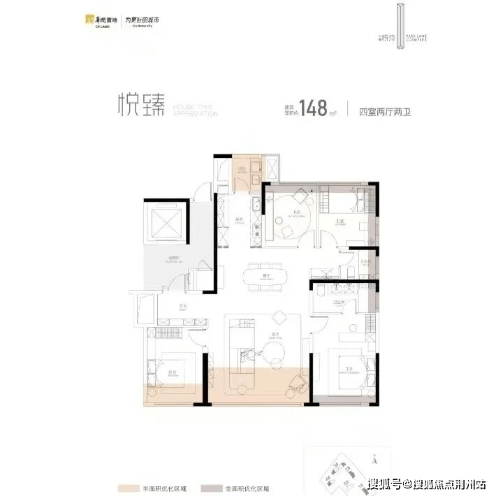 产品定位:准四代住宅,主打建面约148-172㎡纯改善大四房,全盘仅344套,低密两梯两户设计,无超高层及连廊中间套。