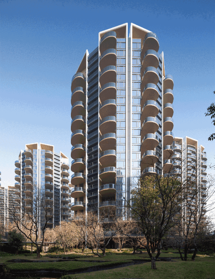 作为华润置地的森系标杆,如何在建筑层面把“呼吸感”美学融入肌理,是设计团队一直在思考的问题,在GAD张微团队笔下,以垂直森林为设计理念,颠覆传统住宅立面的平铺直叙,革新义乌奢宅序列。在选材上选用了大量有机质感材料,仿木纹金属涂料与云白色铝板的搭配,搭配灵动线条与玻璃通透质感,时尚度拉满。奇偶错位的外伸露台,采用高端水晶灰弧形玻璃,局部云石灰色彩釉工艺玻璃,与底部弧形定制化木纹金属铝合金线条构件相互呼应,让外立面如树森落叶般自由延展。