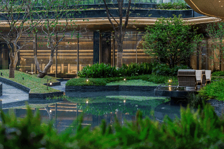 如何把森系自然的松弛感和度假感投射至居所场域,季相首席设计师刘家旭Joey给出了答案,打造“微旅行居所”式景观体验,融汇“自由·生长”的设计理念,构筑【三璟四园十二境】无界森境园林,和空中垂直花园遥相呼应。
