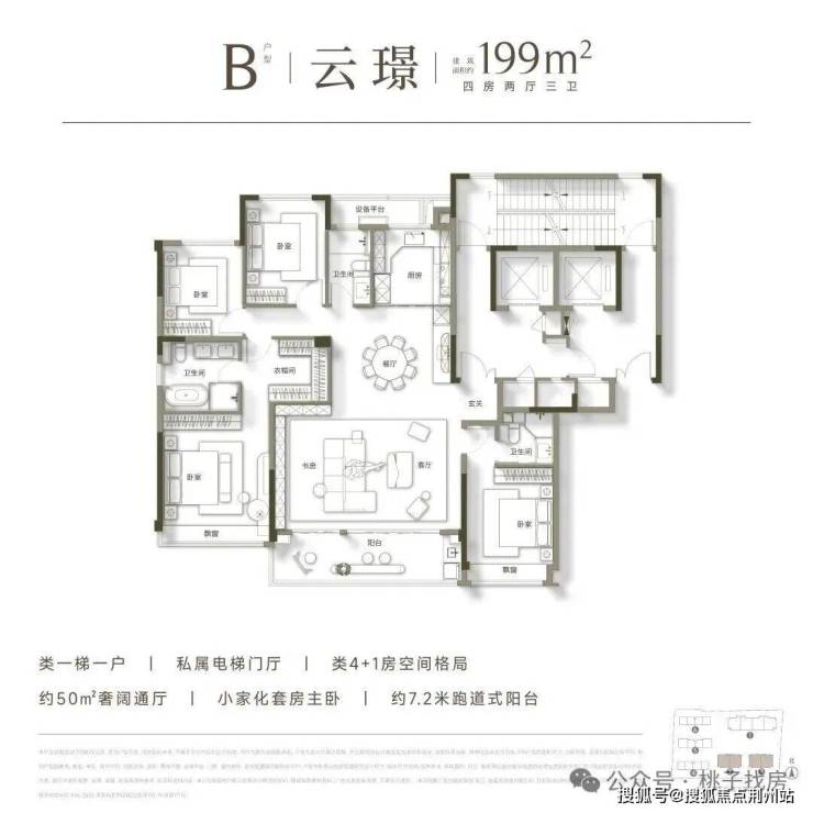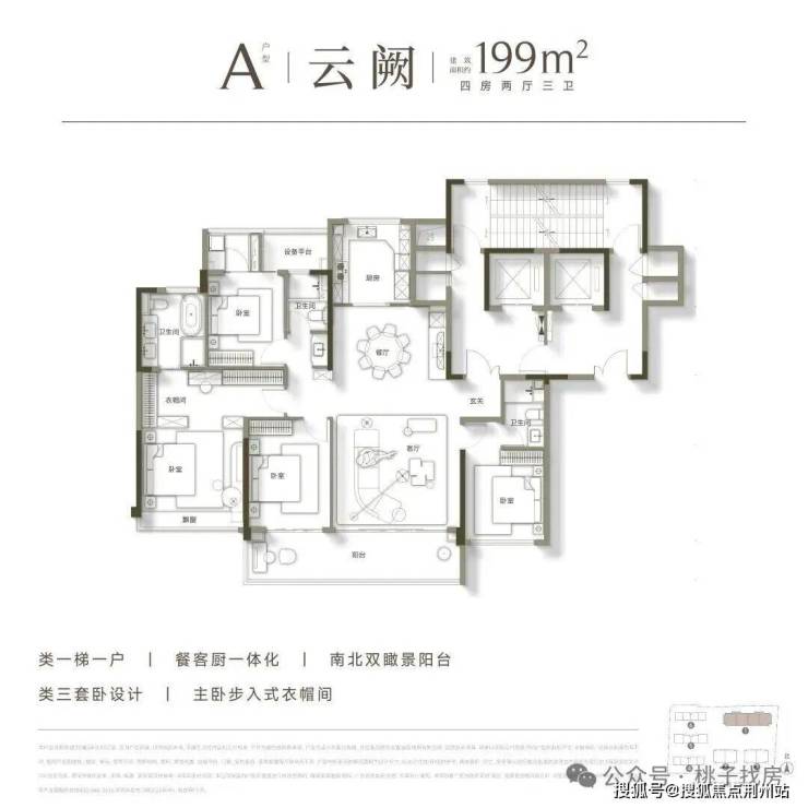 高层建面约199方,有A、B两款,四房两厅三卫双套房格局,南北通透、类独门独户、南向奢阔瞰景阳台,每一个都相当有“杀伤力”。