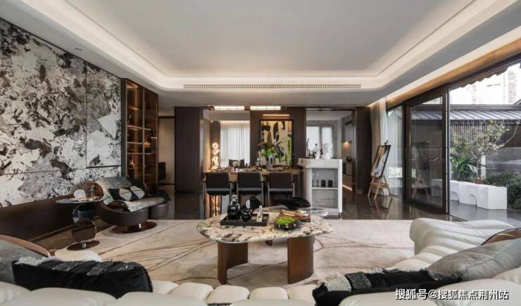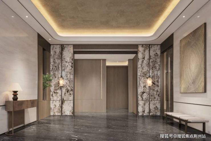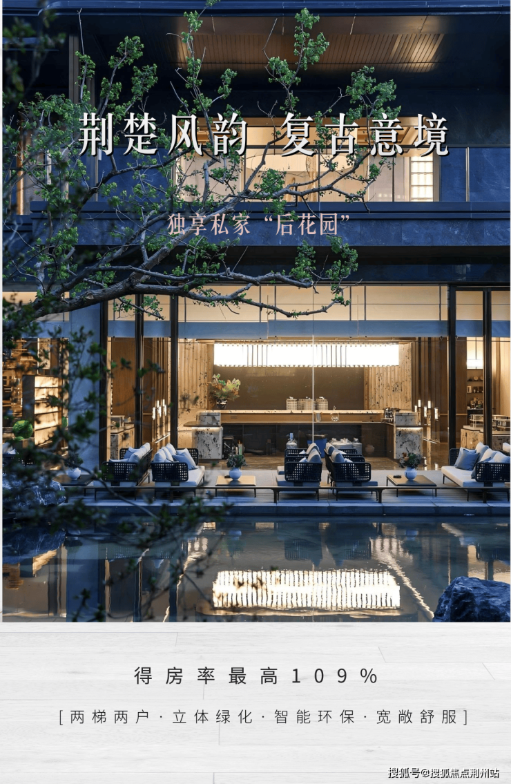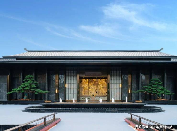 穿过公园便是汉宫屋顶的中式奢阔社区门楼,充满荆楚风韵的酒店式大堂,连接下沉庭院,如诗如画。