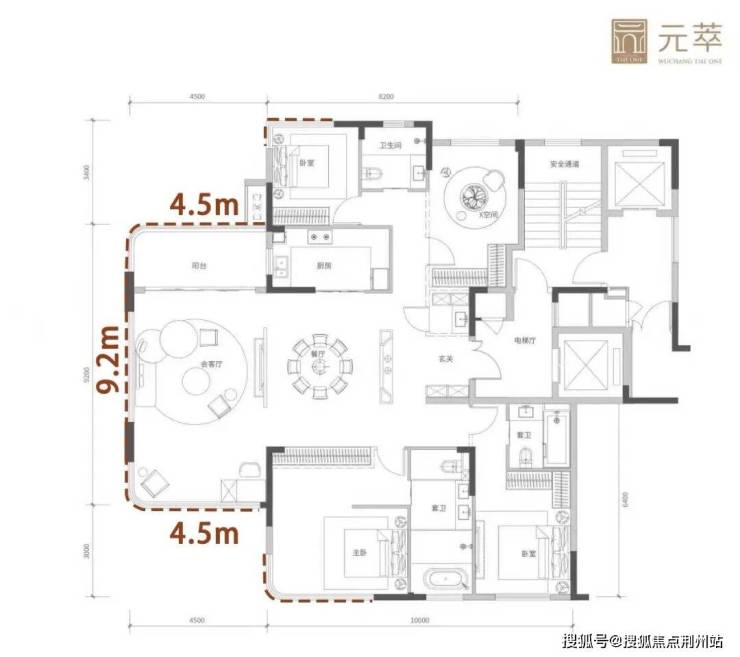 这一规格有多罕见?类似的设计可以看看武汉顶豪项目,建面约173㎡户型主卧套房约34㎡,做的是直角转角窗