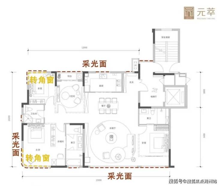 这套建面约143㎡户型,主卧+次卧甚至做了270度无柱化转角窗设计