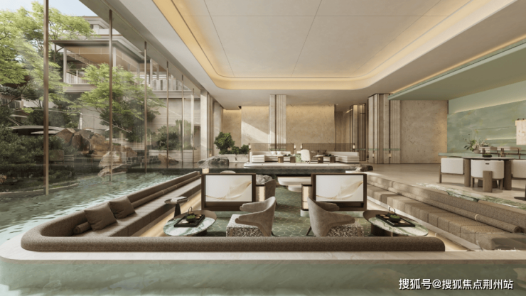 会所设计则汲取《夏山高隐图》的意象,瀑布从石壁倾泻而下,树影摇曳,一派静谧山水,不负临平山下嫡矜宝地。
