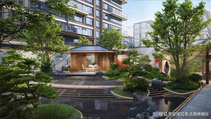 下沉庭院为核心的景观示范区往往是开发商着力打造的重点,含章锦棠的主入口放在了整个地块的西侧,在整体进深60多米的空间内,配置了极为繁复的景观节点。与市政道路交接的地带是一个体量超过50米延展面的门头,大面积金属与石材搭配开阔大气。一个视觉焦点的景墙设计,整面玛瑙绿玻璃砖砌成,景墙之前造型松与水景映衬,形成过渡空间。绕过景墙是灌木与景石交织而成的一个过渡空间,风格平缓,也为整个下沉空间的核心景观埋下伏笔。核心景观区面积并不算太大,却是以精巧取胜。