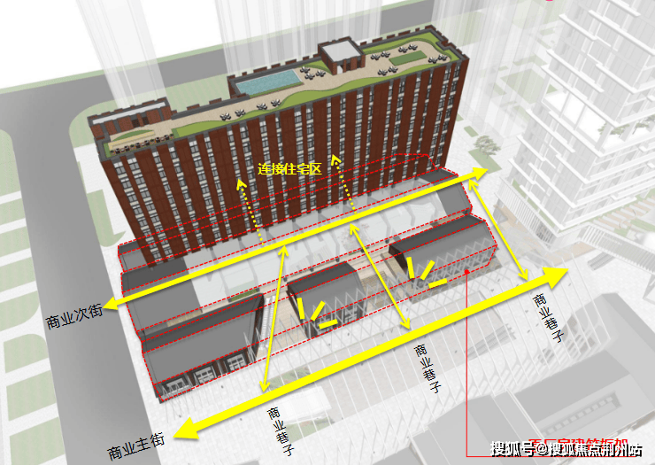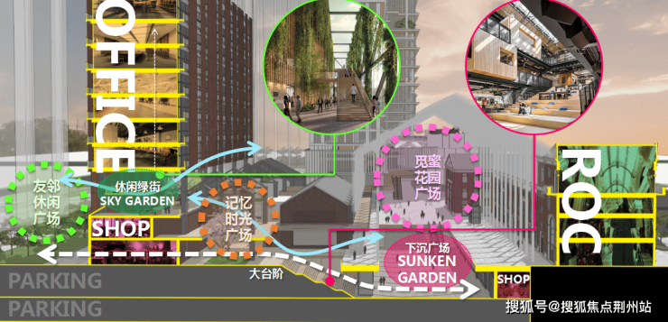 街巷式改造——住宅片区与商业片区的商业动线,通过不同主题的商业广场连为一体。