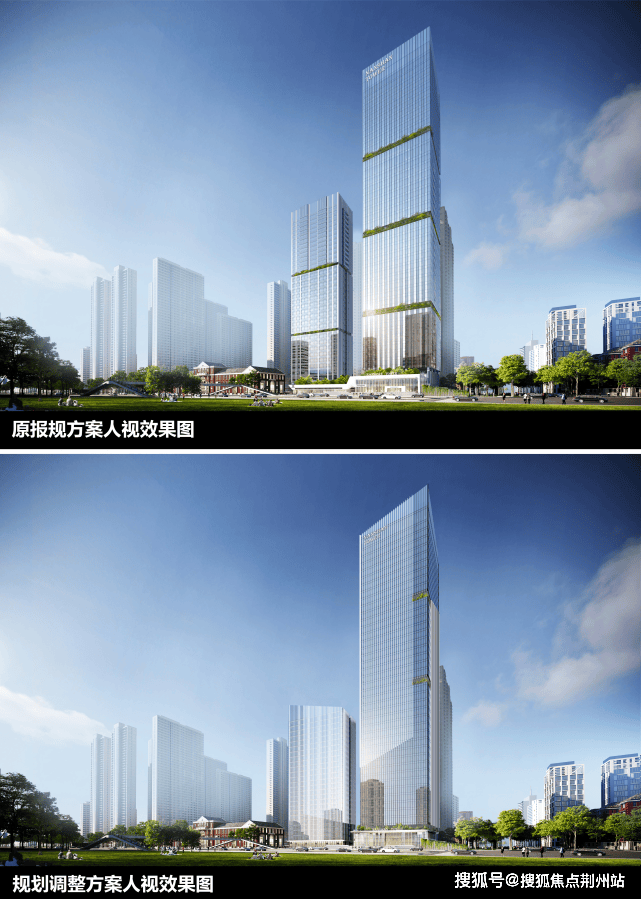 为突出A1塔楼地标性,结合平面调整,立面进行相应调整:抬高塔冠角部提升塔楼视觉高度,与塔冠相互呼应的立面元素包裹两栋建筑,加强双子塔的联系和标志性。增加塔楼的整体统一性。