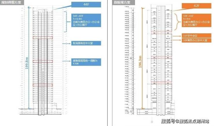 A1楼楼层调整:根据对武汉办公市场的调研,4.4米层高办公产品有较高需求,因此将高区层高由4米提高到4.4米,使A1楼整体高度提升至199.8米,更加凸显A1楼地标的属性。