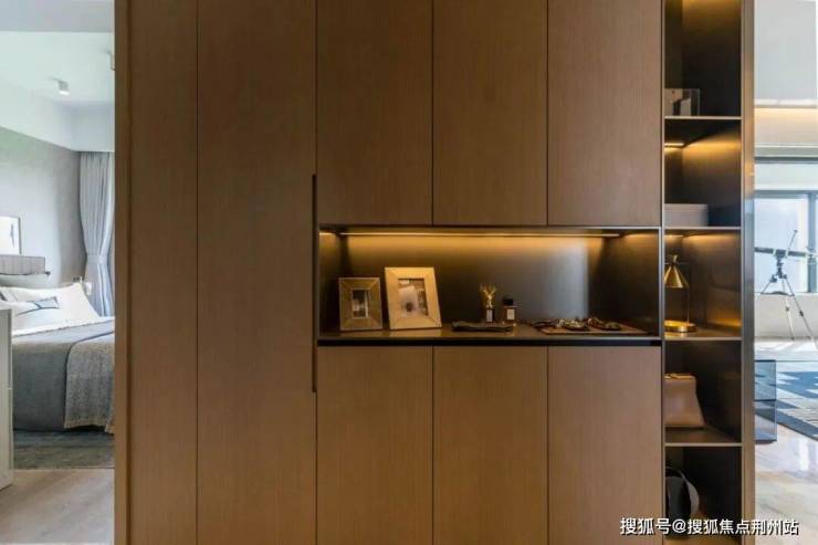 局部木饰面与墙布的复合墙面方案,以低饱和度的50度灰为主色调,搭配温润木质肌理形成层次分明的视觉韵律。