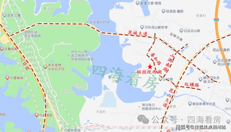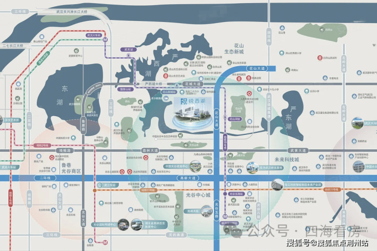 沿花城大道向西可以上三环线,往武汉站、洪山北、光谷核心板块。走花山大道可以直达光谷中心城高新大道。