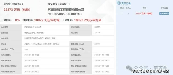 今年1月土拍中,由苏州荣和工程建设有限公司竞得,成交总价2.24亿,成交楼面价18022元/㎡。