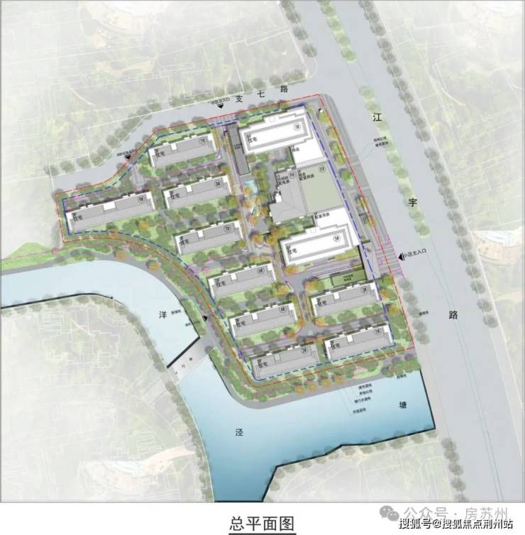 根据总平面图,主入口位于江宇路,次入口位于支七路;西侧还有个小的便民人行口,通过人行桥可到梅巷花园。