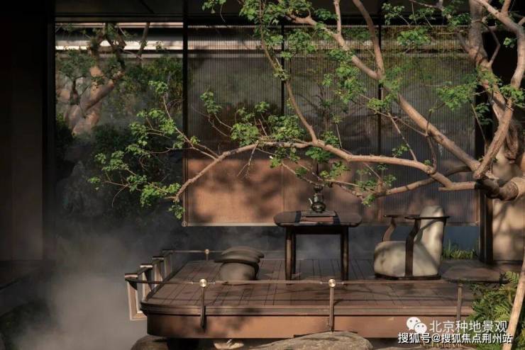 置一茶轩悬浮于石溪之上,水从底部石上流出,深郁的山坳间腾起云雾,弥漫浮动,吞吐变灭。山石自然参差,有沟涧、宽溪、石隙,水在其间流淌、跌落,激荡自然而然的山水清音。山苍树秀,水活石润,青山自青山,白云自白云,世事流淌人在其间,纷扰的尘嚣远去,喧嚣的声音荡尽,回归最原始的静寂的天地。