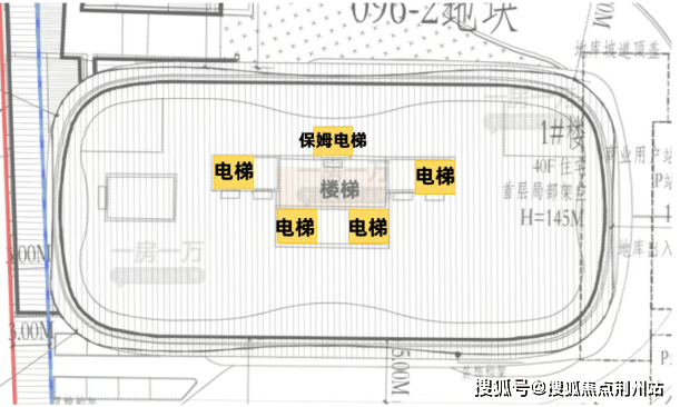 西边地块135米超高层,核心筒布局揭示了项目对垂直交通的极致追求。 楼栋或将配置5部电梯服务2户住宅单元,具体为顶部消防电梯兼家政梯独立运行,中间两户各享两部专属电梯,外加共用消防梯。