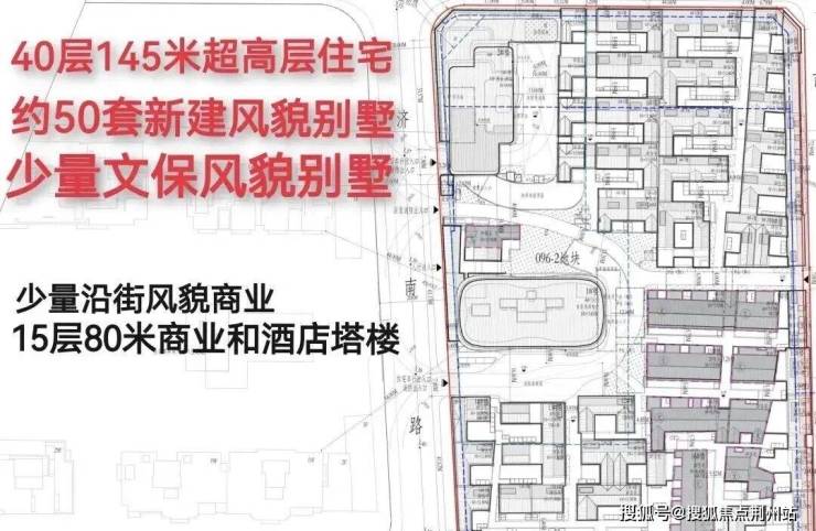 根据公示,项目西半部分096-2地块内规划1幢40F超高层住宅、14幢2-3F风貌别墅,和1幢15F商业酒店、1幢3F商业楼。酒店、商业位于地块西南角。