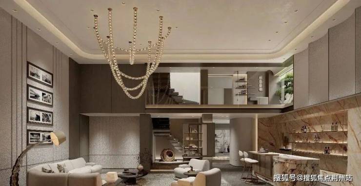 其中,南入口约52米面宽超级界面, 钻石雕刻星光穹顶,门头整体采用沉香米黄石材为主题色调,中间 大面奢石作为背景,提升整体奢品格调,匹配太湖湾人物身份。
