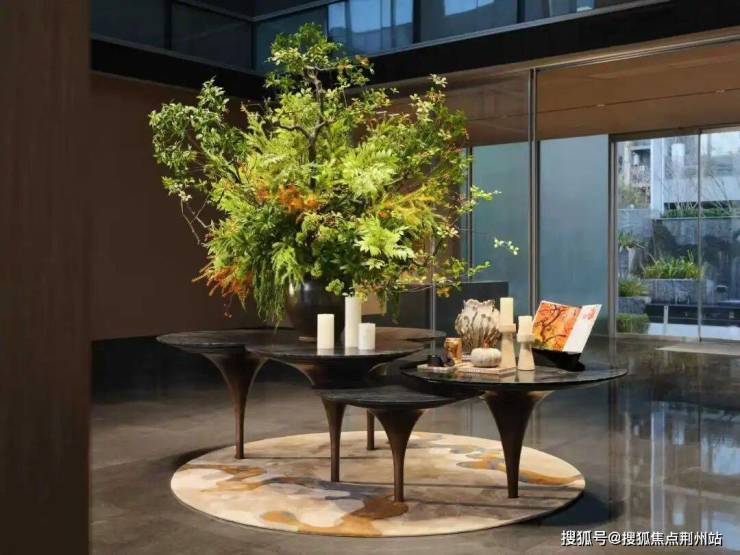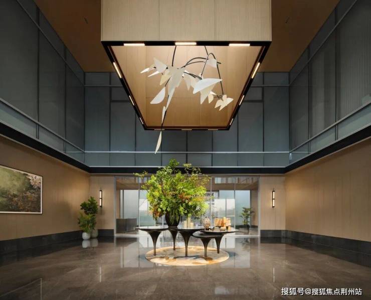 湖与舍充分借鉴“酒店化”的设计语言,打造约40米的酒店式大门,这个超长主入口界面就像奢侈品的橱窗,把湖与舍陈列进了这个大型的橱窗里,自带仪式感、界限感。美国红枫彷如迎宾,叶色春夏深绿,秋季叶色大红带橘红,酷似晴朗天气下落日晚霞的颜色,四季流转,浑然一派“明月枫林照”的意境。进入气派社区大门,即可漫步经过园林水景,进入到星级酒店式大堂,回家的情绪感瞬间拉满。