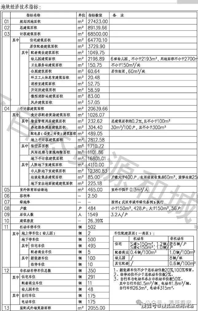项目规划用地面积约2.74万方,总建筑面积约8.91万方,计容建筑面积约6.85万方,住宅建筑面积约6.48万方,容积率2.5,户数484户,机动车停车位502辆,住宅车位495辆,车位配比1比1.02。户均建面约133.8平,户型备注显示150平以下户型为428户,150平以上户型为56户。