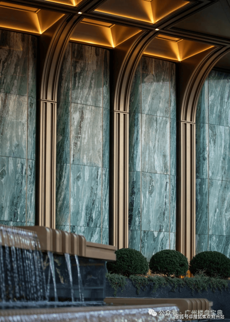 比如,跨越约4000公里从新疆运回广州的维多利亚绿宝石,就铺满了大门两侧的墙壁,不仅有“金镶玉,粤满堂”的美好寓意,也与番禺中央公园的盎然绿意相呼应。