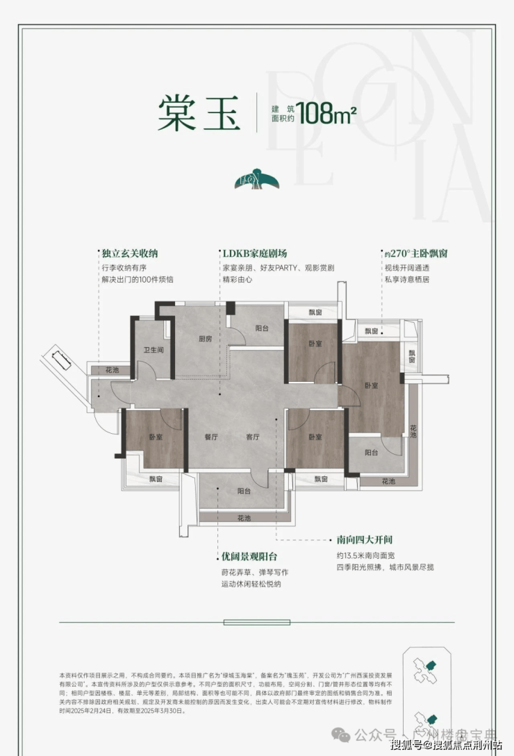 建面105平四房,带入户花园,该户型是东南单边位,做到了南北对流设计,南向四开间朝南,南向面宽约13.5米。
