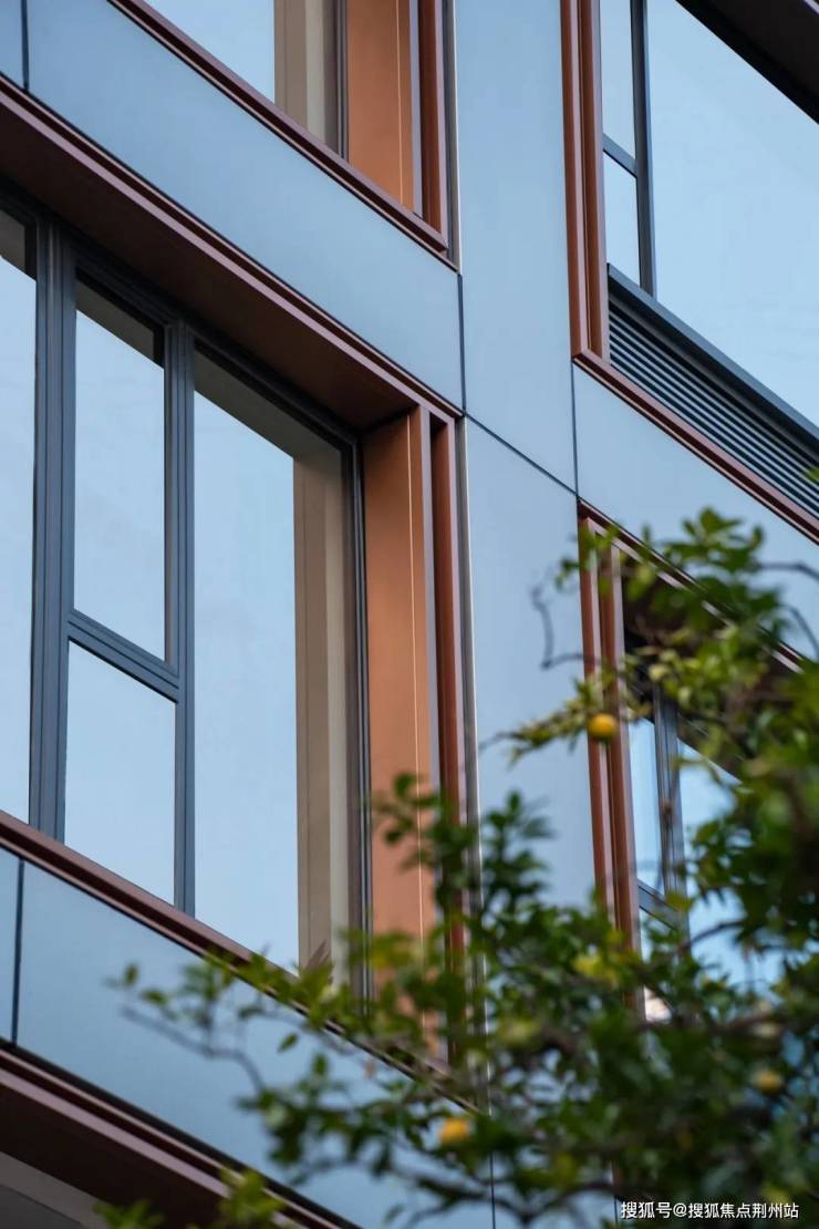 细节上,阳台采用三层暖色金属边框设计,增强立体层次感,避免传统铝板立面的单调性。