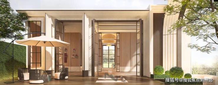 3、风雨连廊形成了无缝归家动线,可以随时欣赏中央的四棵名贵乔木,在风雨连廊的材质运用上,也讲究材料的质感与空间的气场,贝金米黄石材和金属铝板的巧妙结合,演绎出豪宅该有的先锋感与精工感;