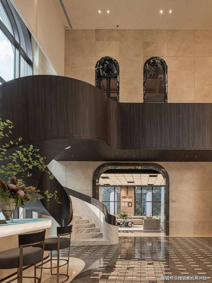1、北侧的漂浮花园既能观景会客,也引人向上/下,从室内踏入到花园的瞬间,随着阶梯水景错落抬升,即能看到嵌在水景下沉式卡座,又能仰望小区的风雨连廊,实现零距离的内外互动场地;