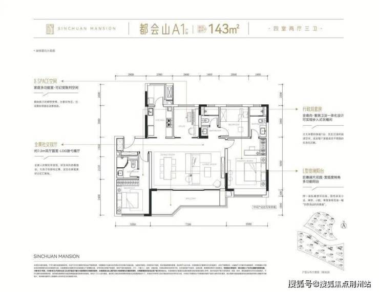 中海·新川华府建面约143㎡套四双卫户型,在做了“约7.2米大横厅+L型景观阳台”设计的同时,也是配置了“双套房”。