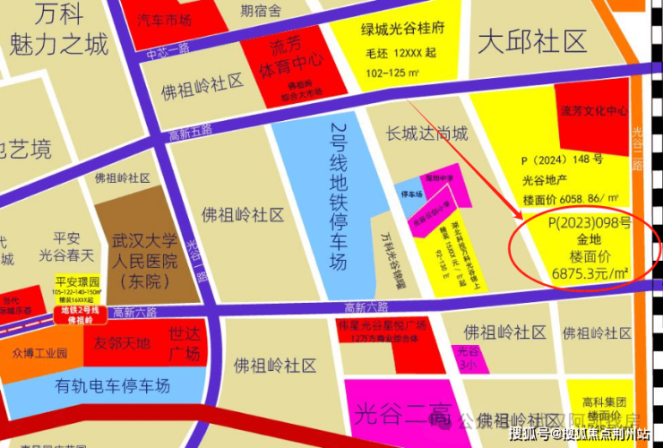 2023年12月22日武汉土拍中,光谷P(2023)098号纯住宅地块由武汉光谷地产有限公司以底价9.3亿元摘得,楼面价6875.27元/平。
