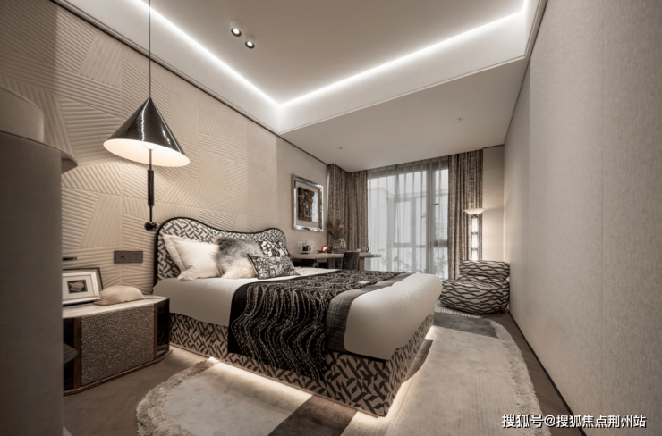 即便放了双人床、两个床头柜、一个收纳柜、两个休闲座椅和茶几,空间依旧绰绰有余,尺度感惊人!
