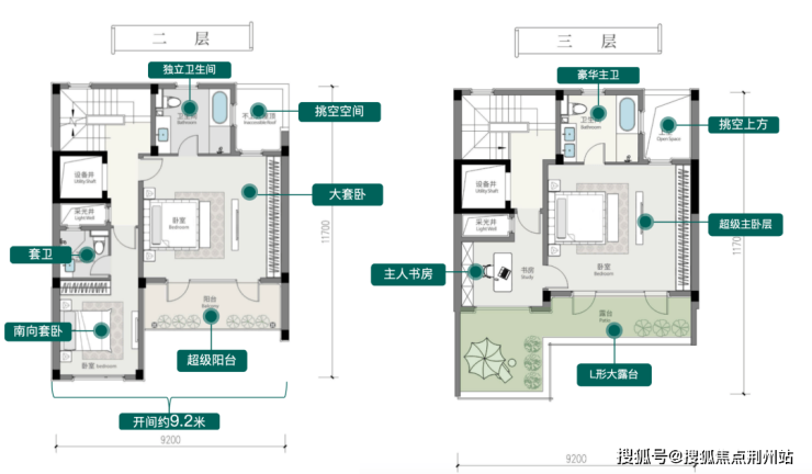 二层双套房设计,均配有卫浴间、衣帽间;三层豪华套房主卧+书房空间近50㎡...