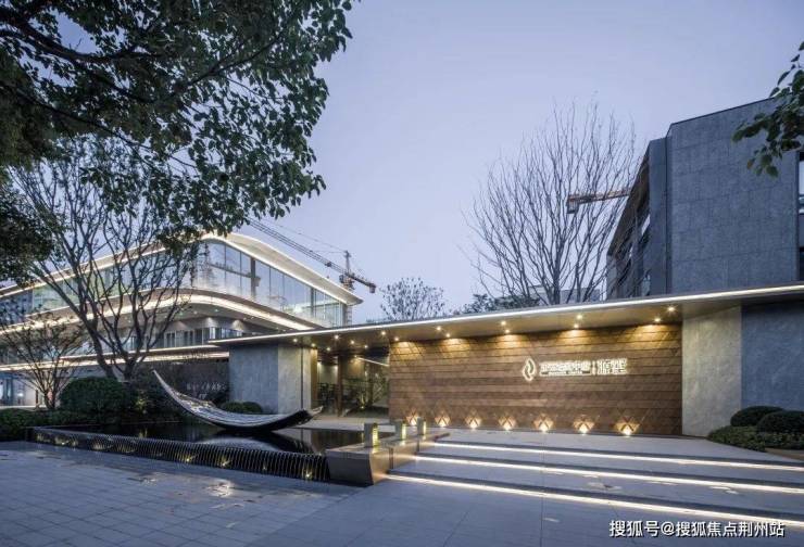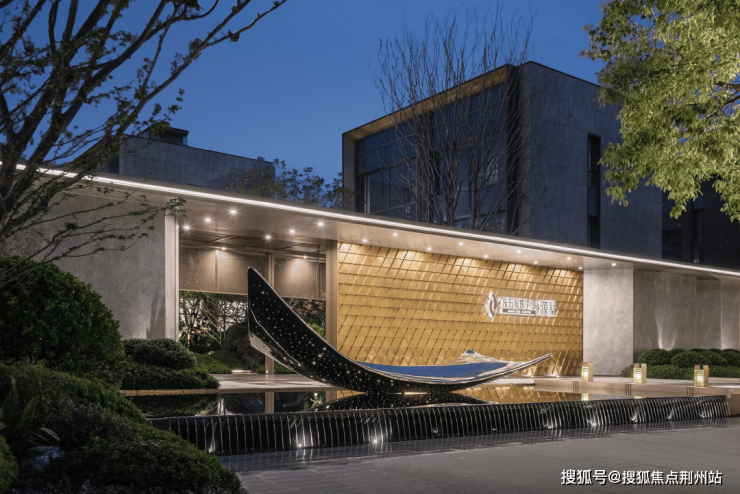 【金舟寻源】,自古商贾文化中便有“遇水生财”的说法,项目自前场进入公共庭院,大片镜面水景之上浮着“金舟寻源”的主题雕塑,不仅寓意美好,隐喻苏商从长江起家的奋斗历史;而且潺湲流水增加空间的灵动之感,丰富空间美学艺术。