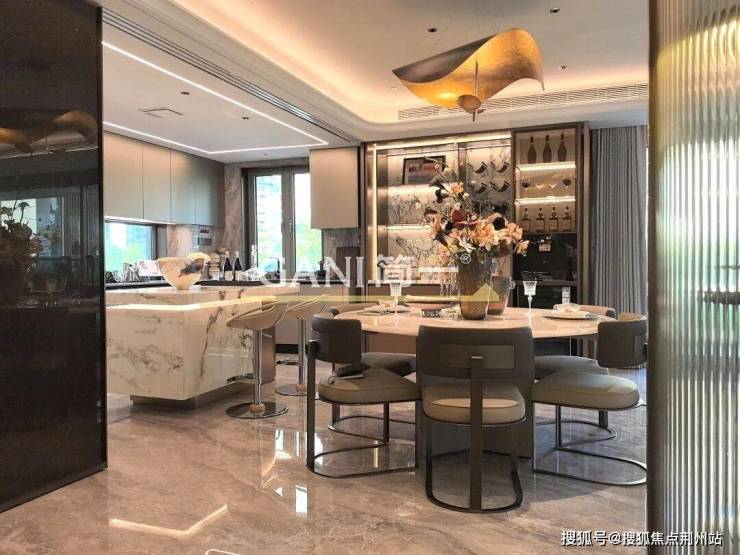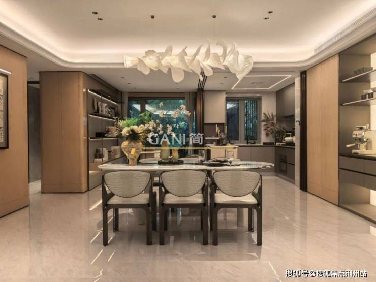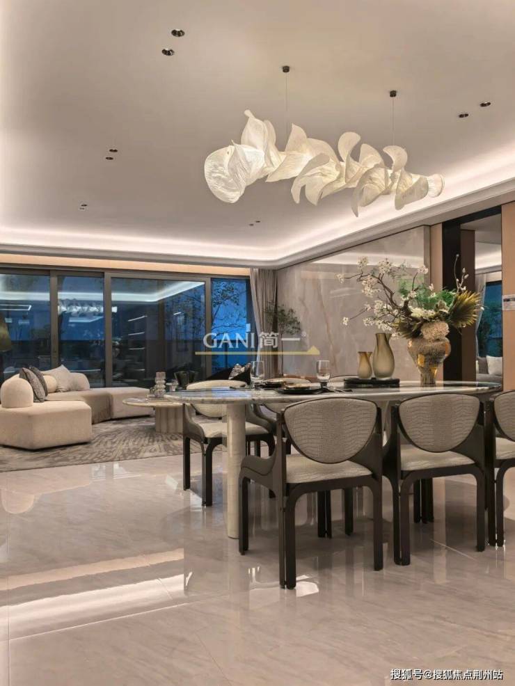 客餐厅设计在细节打造上也是精益求精,地面选用简一<0.5mm密缝铺贴的大理石瓷砖、奢雅格调装饰、美学弧形吊顶…从选材到铺装,打造实用、舒适、高级、美观于一体的超级豪宅理想居所。
