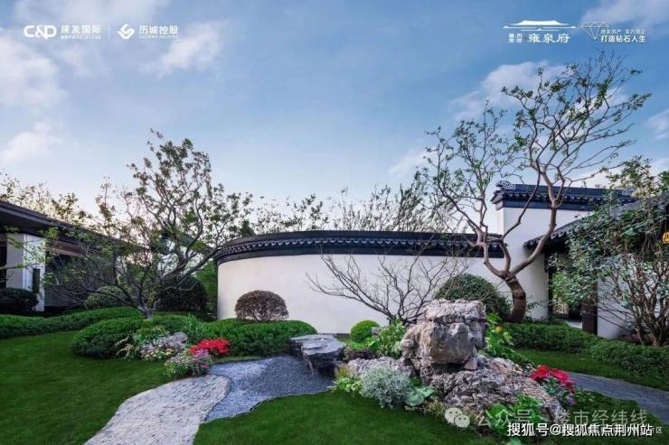 建发·雍泉府园区师法江南名园网师园,打造四进归家礼序,以恢弘雄伟的王府中式大门礼遇望族门风,配置九大景观节点,运用斗栱、椽子、回纹、浮雕等中式细节设计,特邀香山帮匠人手工打造,亭台楼阁、堆坡造景,营造步移景易的江南园林。