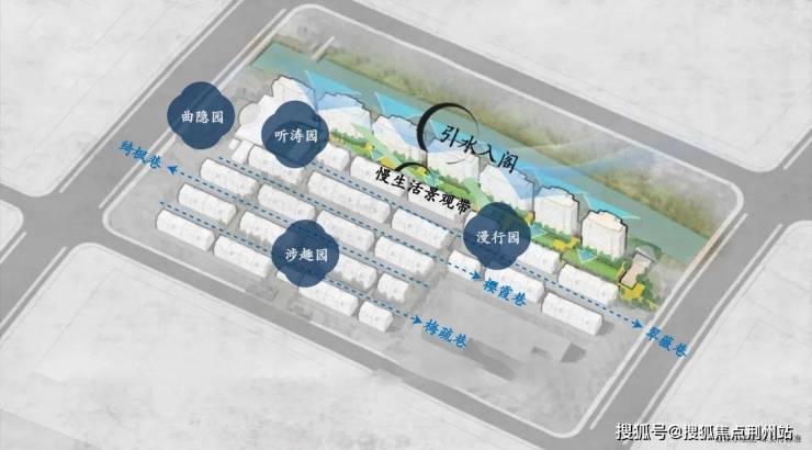造园理念“借景共融”,引太湖水入园,打造“一畔四园一带四巷”的立体园境体系。