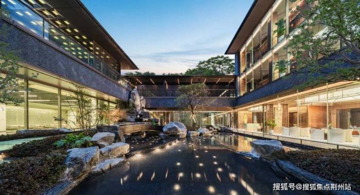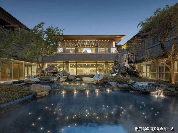 下沉庭院采用扬州传统的叠石技法,六米高的瀑布倾泻而下,公区大量奢石、名贵树木的运用,呈现隐贵气质。