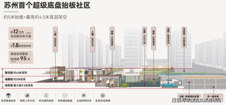 “悬浮”的社区,更自由的呼吸。约5米的抬板设计,让整个社区仿佛悬浮于地面之上,营造出一种轻盈、通透的视觉效果。走在社区里,你感受到的是开阔与自由,而不是传统社区的压抑与局促。