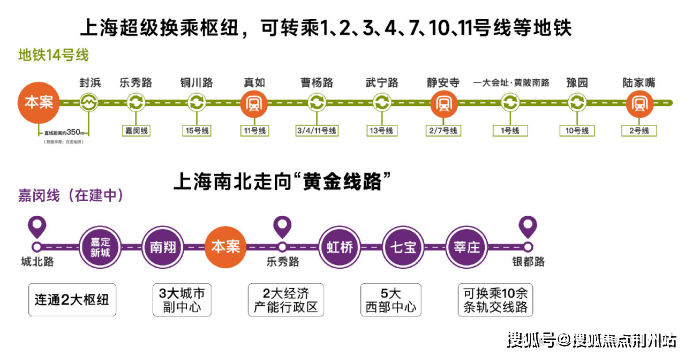 交通能级不断跃升:14号线和嘉闵线(在建中)双轨交汇,直线距离约350米14号线地铁口,14号线为高能级地铁线,5站普陀,30分钟直达静安,且始发有座,出行舒适;黄金走廊嘉闵线加速建设,约3站虹桥枢纽,未来可速达七宝、徐家汇、莘庄等核心区域。项目周边开泰路即将建成,绿野谷二期路段、骏达路、童家桥路、昌瑞路、涟澜路已启动建设,预计2026年建成。