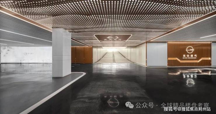 即将公开的G1主题架空层,地面精选深色仿古地砖,墙面采用浅色墙面砖,缀以金色隔断屏风,整体视觉上传达了一种雅奢的腔调。除了文创区,G1架空层内还打造社区会客空间和红叶空间。既可供来访会客,邻里交流,也可变身观景的小憩之处。坡道玄关的天花板铺设了星空顶,奥体潮鸣logo,配以定制的潮涌水波纹,熠熠生辉,点亮归家之路。
