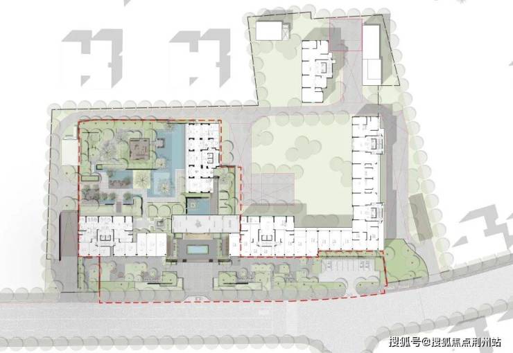 步入园区之后扑面而来的是度假感,水院围合出的一方天地让繁华与宁静在此转身,浓荫下是盈润流水,拂拭城市的喧嚣,让回家的心情在这里转换。“ 院落式景观、水院、树池、与矮景墙穿插,艺术水院 ”等场景打破建筑与室外的边界,室内外有机渗透,塑造层层递进的舒缓场景。