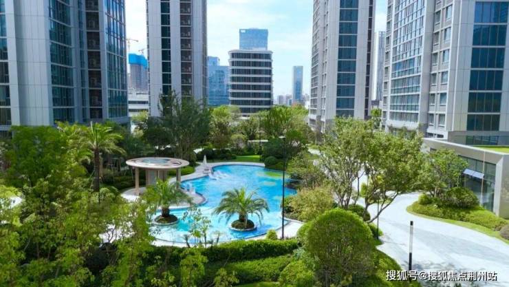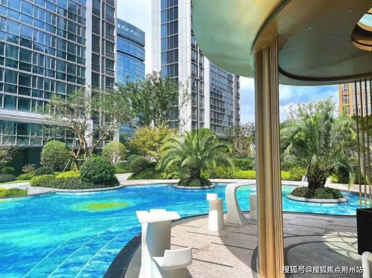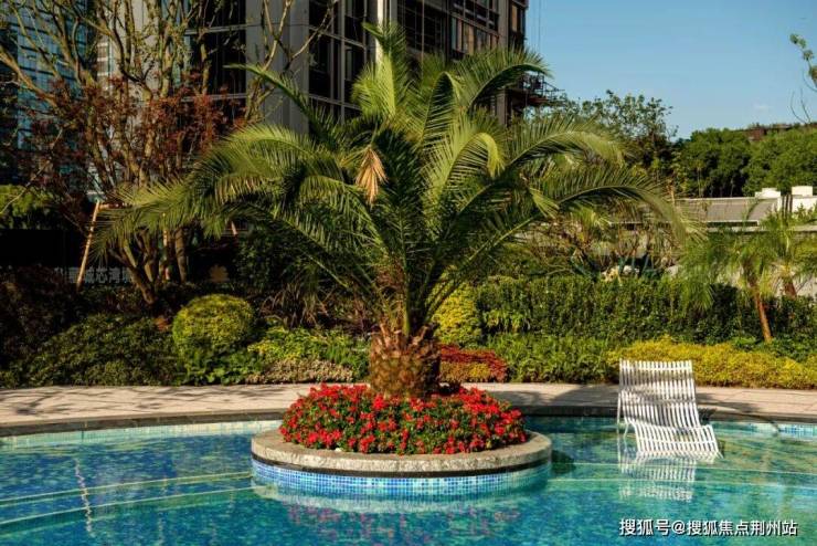 整个水池,就像镶嵌于园林中的蓝宝石,周围种植了大量热带棕榈树,是独属于快节奏都市中的一抹松弛感。