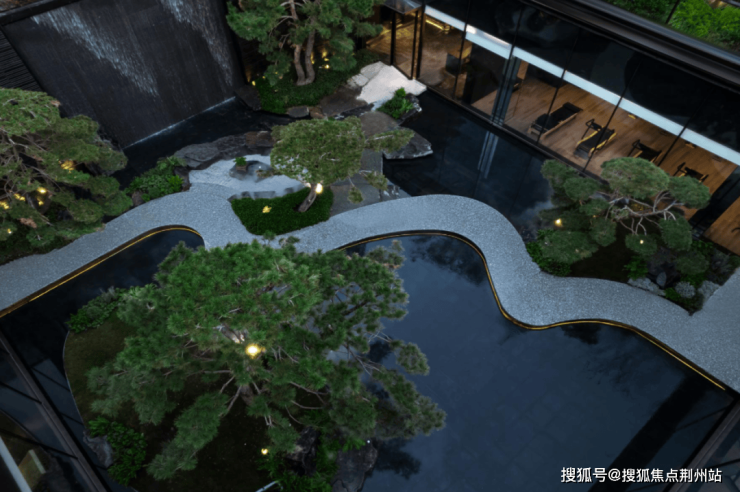 项目所在的地块堪称狮山极核——日趋紧张的当下,项目充分利用土地空间打造景观与公区。示范区园林,以“万壑松风”为灵感,提炼松林、飞瀑、石径、云雾、流泉五大场景,5棵泰山全冠移植的黑油松傲然挺立,约6米高的黑金沙花岗岩叠景墙流水潺潺,更有“翠玲珑竹节景墙”致敬沧浪亭,将苏州文化符号转化为可触摸的日常景观。整个社区景观面积充足,形成“内外双园”的格局,内部园林与外部运河景观相互呼应,为业主提供了静谧的休憩空间。