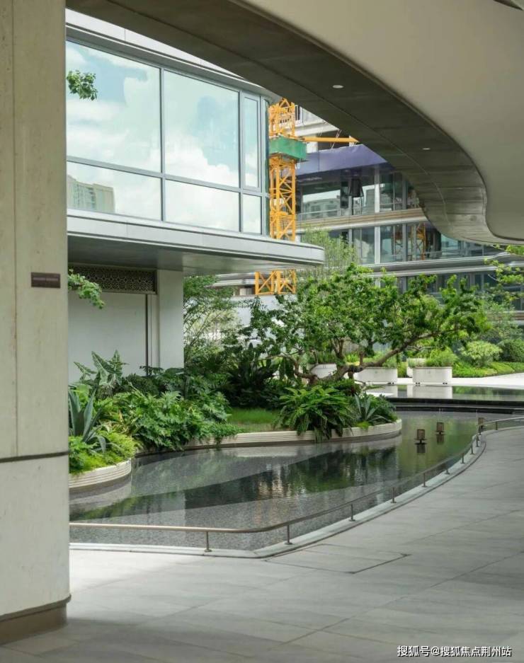 连廊下的水景,被绿植层层包裹。水边种满了各种植物,有高有低,有深绿有浅绿,看着就像把小森林搬来了水边。