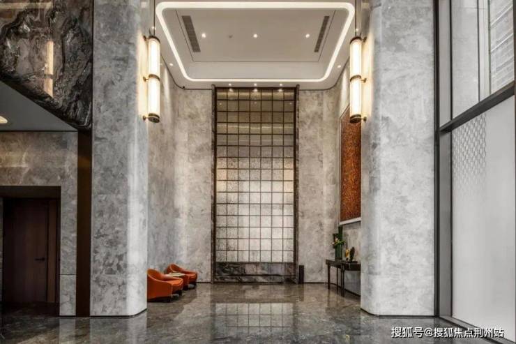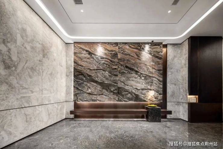 地上地下双入户大堂内部的墙面摈弃了传统的涂料,大面积采用了明亮且纹理丰富的灰色石材,搭配独特纹理的威尼斯棕石材,全方位营造出尊贵典雅的空间氛围。