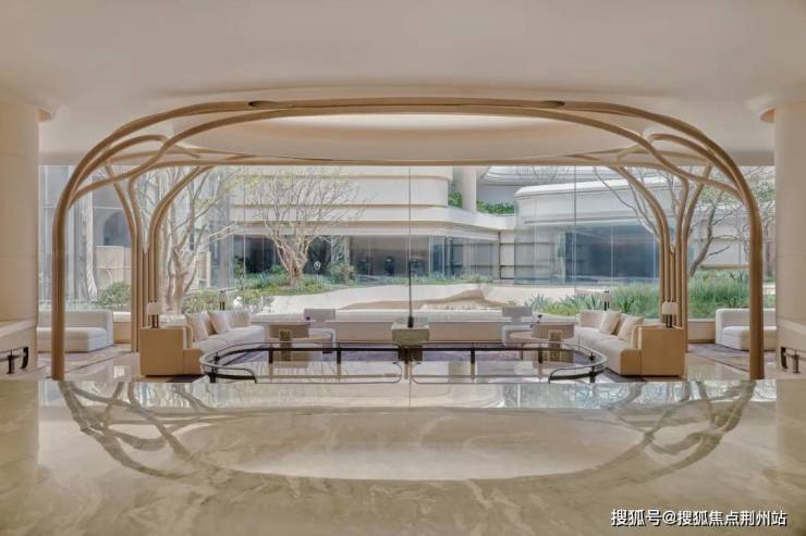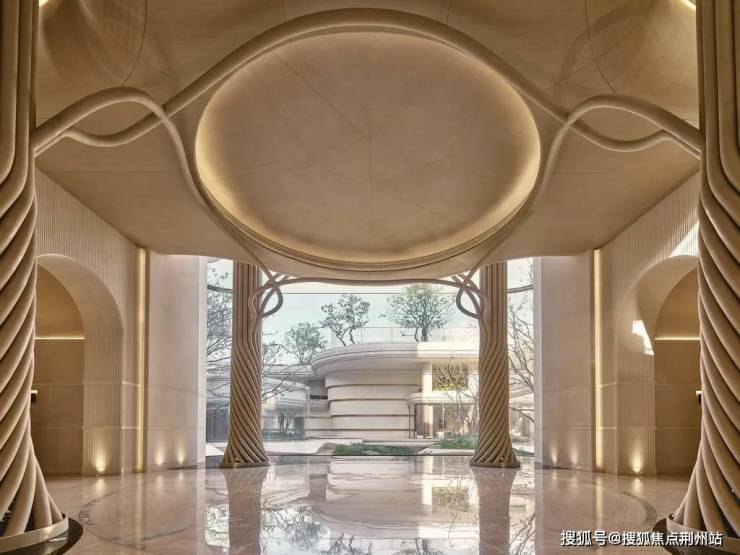 大门内外两重门厅景墙运用月光米黄石材近1000 方,搭配香槟金金属线条,汲取爱马仕全球旗舰店的双曲面叠墙造景手法,增加景墙奢华质感。 项目沿河的楼幢整体上抬,也就是——抬地式。好处在于地库通风,客户行车归家动线更合理。