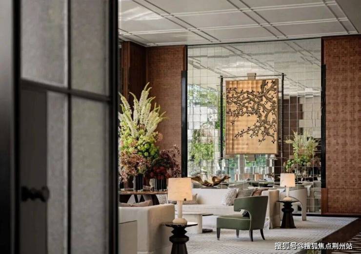 在生活馆里,你能看到发光石材的背景墙,瑰丽酒店同款壁灯、昂贵的黄虎眼奢石制作的接待台、同源瑰丽的风泥客石屏风、手工敲荔枝面……