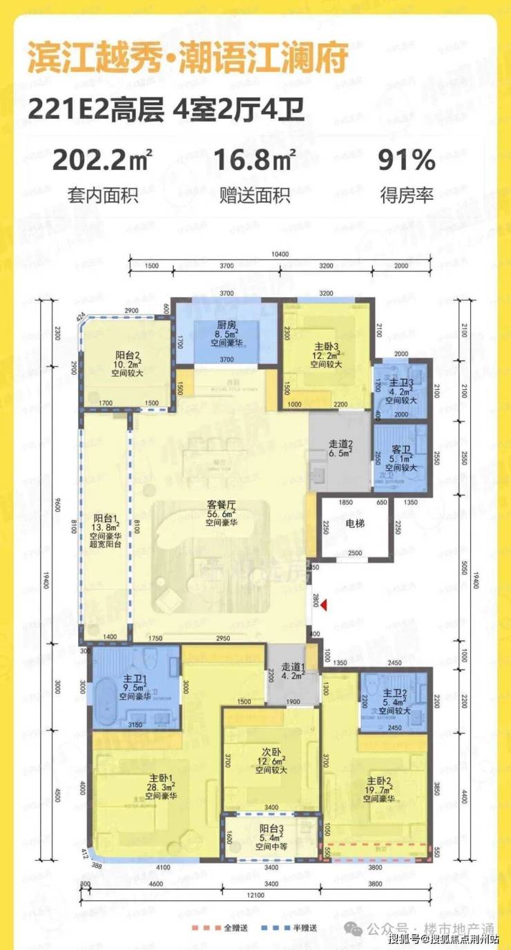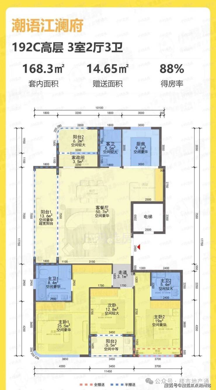 3)192方边厅户型:4房2厅3卫,得房率88%