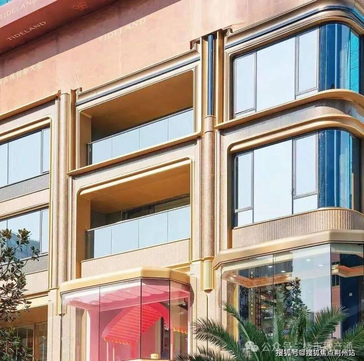 4)外立面:底部石材+四面铝板+圆弧玻璃,有小部分涂料;南面香槟金铝板+部分陶板,全域风雨连廊,还有滨江标志性蓝宝石泳池