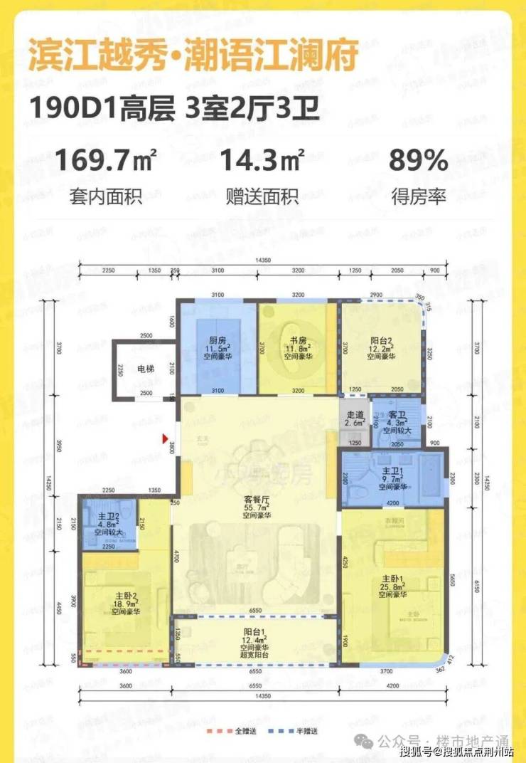 优点:类四叶草户型,南向面宽达14米,客餐厅尺度非常阔绰,面积有55平,可以放圆桌;南北通透