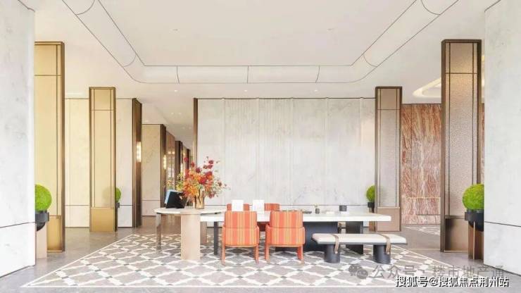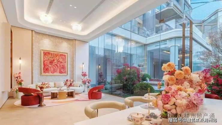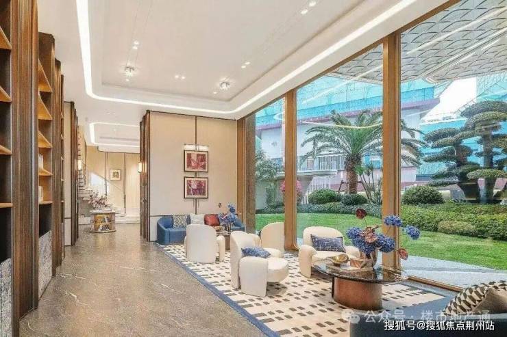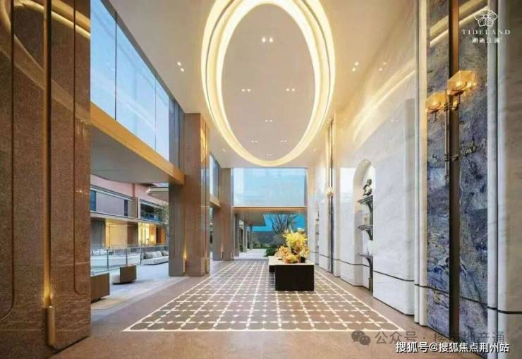 再往里走是归家大堂,水景吊灯非常亮眼,落地玻璃可以直面下沉式庭院